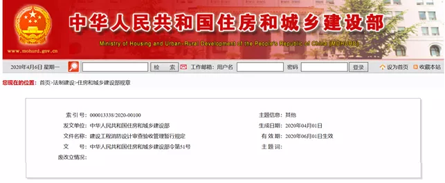 2019年5月10日,司法部法制信息網(wǎng)公開征求意見系統(tǒng),面向全社會(huì)公開征求《建設(shè)工程消防設(shè)計(jì)審查和驗(yàn)收管理規(guī)定(征求意見稿)》意見。時(shí)隔半年后,標(biāo)題最終修改為《建設(shè)工程消防設(shè)計(jì)審查驗(yàn)收管理暫行規(guī)定》(以下簡(jiǎn)稱《規(guī)定》),并于2020年4月4日,已經(jīng)住房和城鄉(xiāng)建設(shè)部部務(wù)會(huì)議審議通過,以住房和城鄉(xiāng)建設(shè)部令第51號(hào)發(fā)布,并自2020年6月1日起施行。新規(guī)明確了履行消防設(shè)計(jì)審查驗(yàn)收,備案抽查職責(zé)的同時(shí),增加了優(yōu)化營(yíng)商環(huán)境、工程建設(shè)項(xiàng)目審批制度改革等內(nèi)容。
