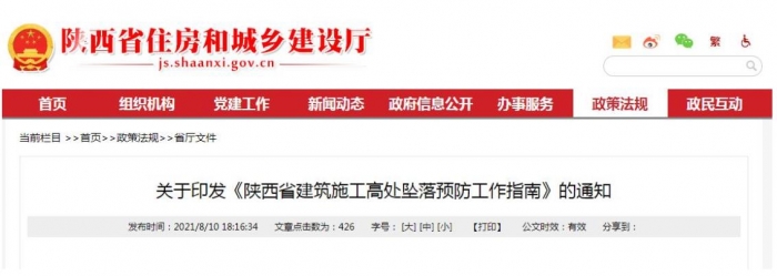 關于印發(fā)《陜西省建筑施工高處墜落預防工作指南》的通知