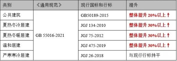 《通用規(guī)范》提高了居住建筑、公共建筑的熱工性能限值要求,與大部分地區(qū)現(xiàn)行節(jié)能標(biāo)準(zhǔn)不同,平均設(shè)計能耗水平在現(xiàn)行節(jié)能設(shè)計國家標(biāo)準(zhǔn)和行業(yè)標(biāo)準(zhǔn)的基礎(chǔ)上分別降低 30%和 20%。