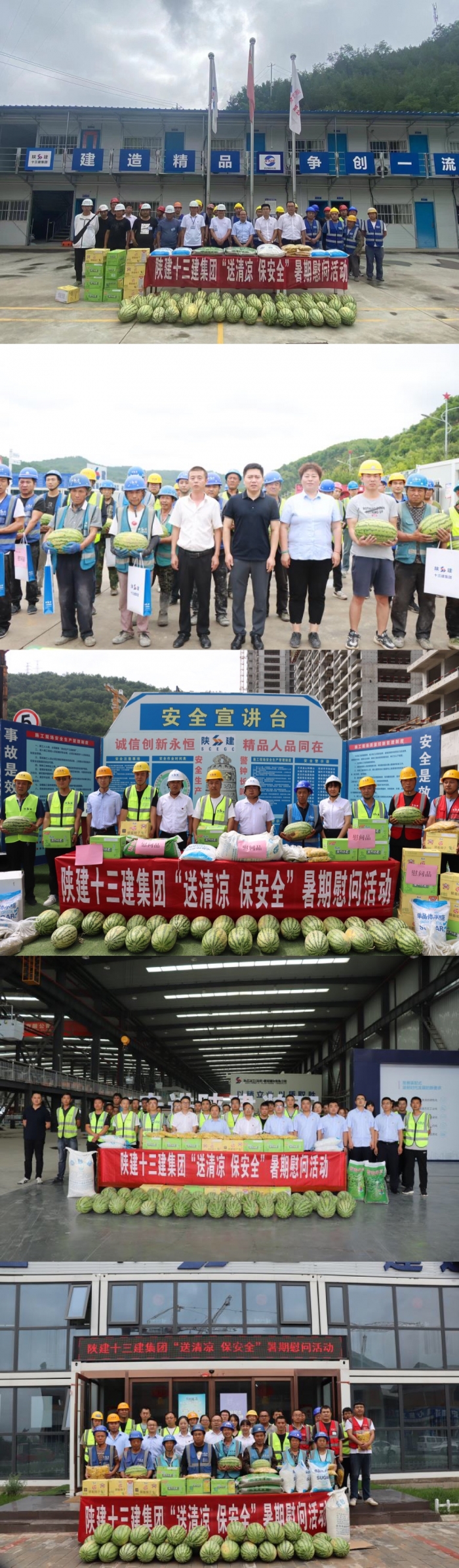 集團(tuán)總工程師王弘起,副總經(jīng)理?xiàng)钣篮?,副總?jīng)理張?chǎng)蝹ィ倳?huì)計(jì)師劉小衛(wèi),紀(jì)委書記、工會(huì)主席李靜分別前往延安市社會(huì)福利院遷建項(xiàng)目(一期)、延安南泥灣工匠學(xué)院項(xiàng)目、伴山樾谷·芳菲里項(xiàng)目、延安新型建材公司、信天游文創(chuàng)餐飲街區(qū)等項(xiàng)目開展慰問活動(dòng),代表集團(tuán)公司對(duì)高溫天氣堅(jiān)守在一線的廣大員工及工友表示親切的問候和衷心的感謝,并為大家送上西瓜、白糖、綠豆、菊花、冰糖、飲料、花露水等防暑降溫物品。同時(shí),叮囑項(xiàng)目部要始終把安全放在首位,科學(xué)安排施工作業(yè)時(shí)間,做好后勤保障工作,制定防暑防汛工作預(yù)案,在確保一線施工作業(yè)人員健康安全的前提下抓質(zhì)量提進(jìn)度,緊盯項(xiàng)目節(jié)點(diǎn)目標(biāo),圓滿完成各項(xiàng)建設(shè)任務(wù)。