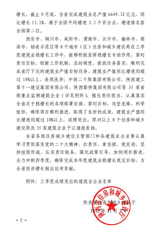 11月2日,陜西省住房和城鄉(xiāng)建設廳發(fā)布《關于對2022年三季度建筑業(yè)穩(wěn)增長工作表現(xiàn)突出單位和建筑業(yè)企業(yè)的通報》,集團被省住建廳評為“三季度成績突出建筑業(yè)企業(yè)”。